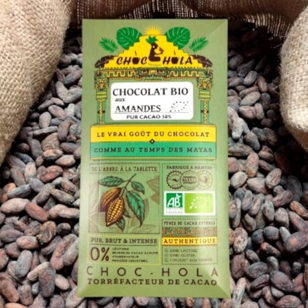 Tablette Chocolat Noir Intense Bio 100 % – Ingrédients : Fèves de cacao* (50 % min), sucre de canne*, amandes (20%)*.